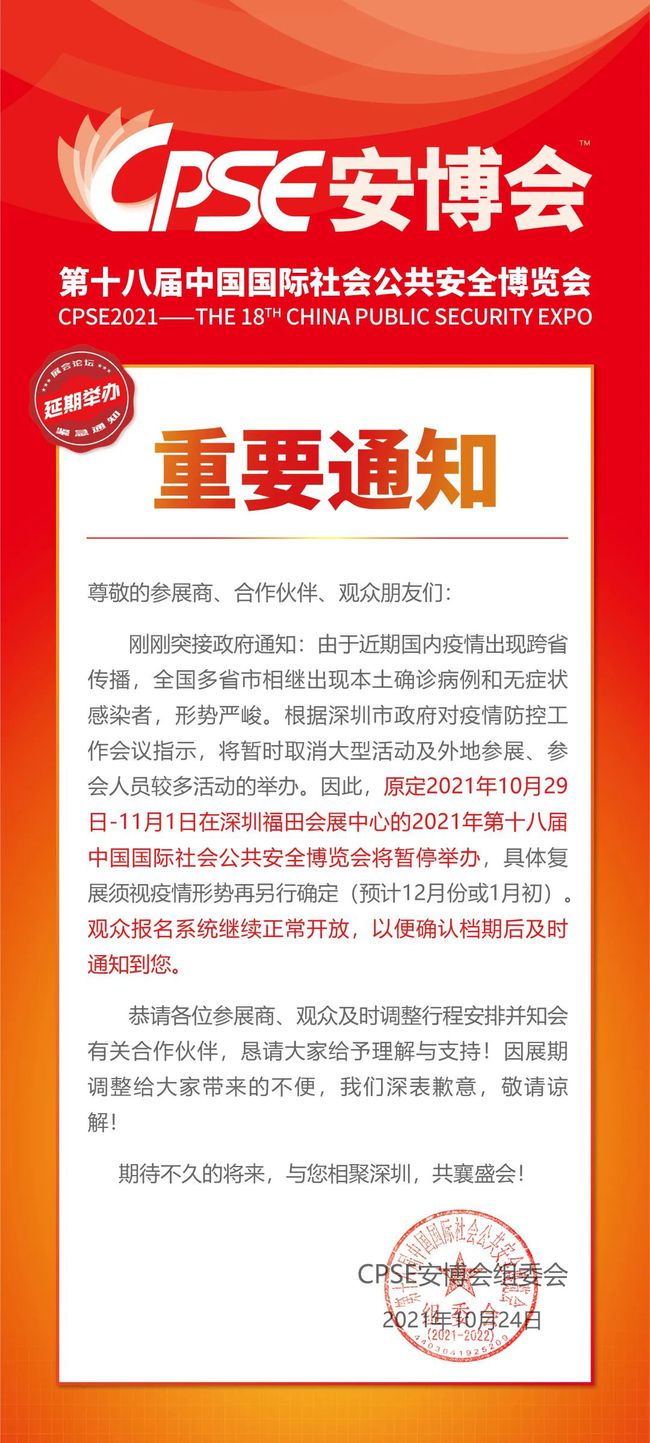 接CPSE安博會(huì )組委會(huì )通知,因近期疫情跨省蔓延,原定2021年10月29日-11月1日在深圳福田會(huì )展中心舉辦的2021年第十八屆中國國際社會(huì )公共安全博覽會(huì )將暫停舉辦,具體復展須視疫情形勢再另行確定(預計12月份或1月初)。