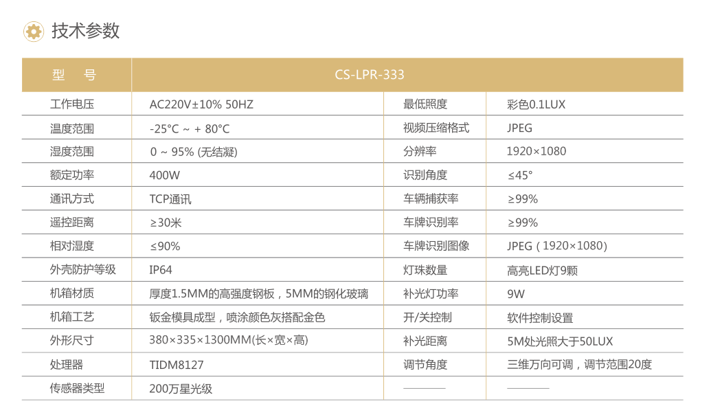 正面采用玻璃面,搭配 P 字背光,外形大氣,更具科技感,同時(shí)搭配金色圓弧包邊,讓產(chǎn)品更具奢華感高度集成,集成車(chē)牌識別單元和道閘單元,一機搞定,節省安裝位置,提高安裝效率智能補光控制系統,由軟件控制補光燈,采用時(shí)控開(kāi)關(guān),補光燈亮度可設置為隨時(shí)