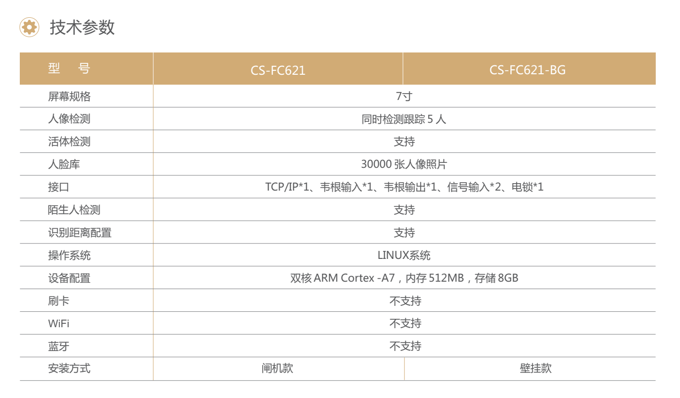 CS-FC621/-BG是一款高性能、高可靠性的人像識別產(chǎn)品,依托 深度學(xué)習算法,具有識別速度快、準確率高的特點(diǎn)。支持人像識 別 1:1 和 1:N 模式,支持外接刷卡。 應用場(chǎng)景: 工地實(shí)名制通道、學(xué)校、社區、寫(xiě)字樓、酒店、商場(chǎng)、 商店、 公共服務(wù)場(chǎng)所等。