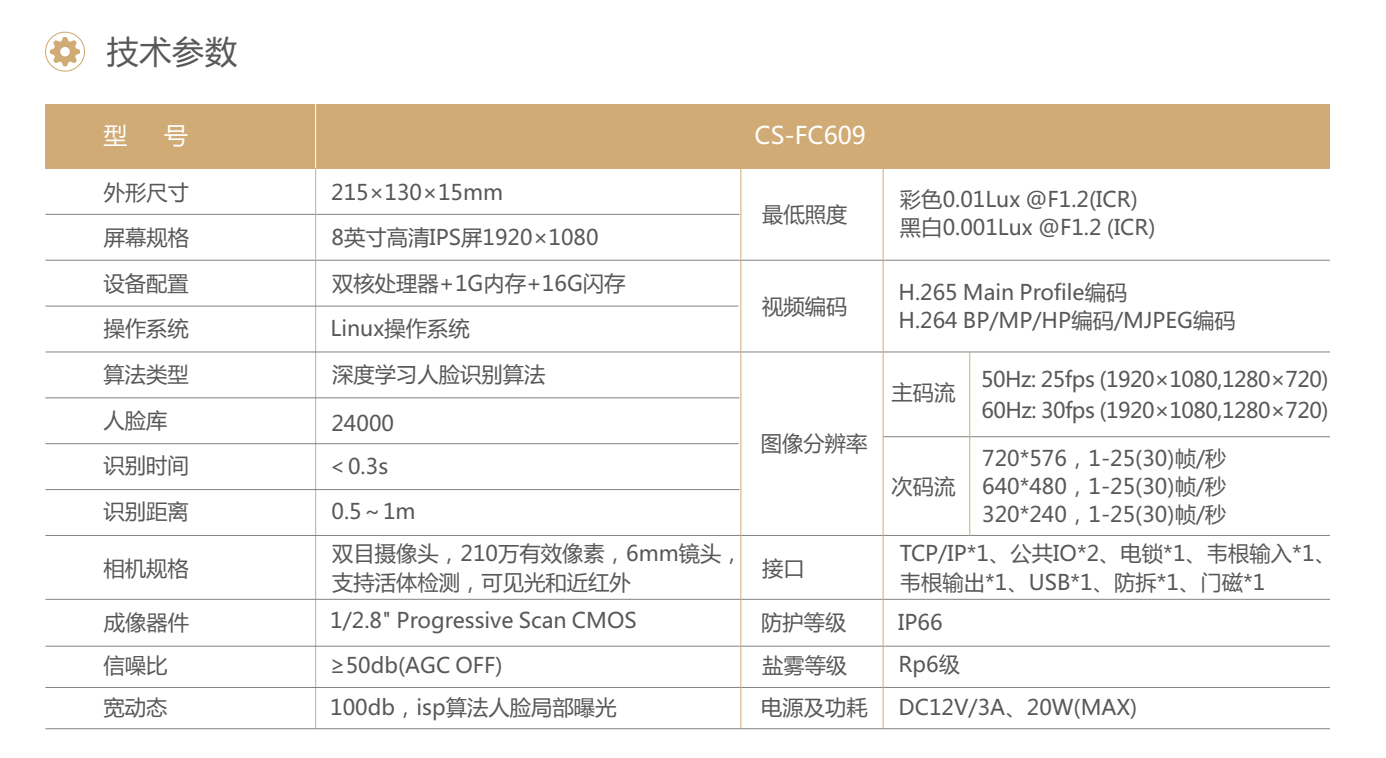 CS-FC609是一款高性能、高可靠性的人臉識別類(lèi)產(chǎn)品,依托深度 學(xué)習算法,識別速度快、準確率更高,支持人臉識別、刷卡或相 互組合的識別方式,主要應用于平安社區、企事業(yè)單位、政府大 樓、金融網(wǎng)點(diǎn)、監獄等室內場(chǎng)所,人臉識別終端具備高識別率、 大庫容、識別快等特點(diǎn)。